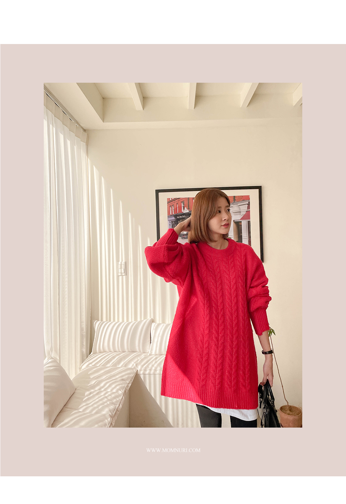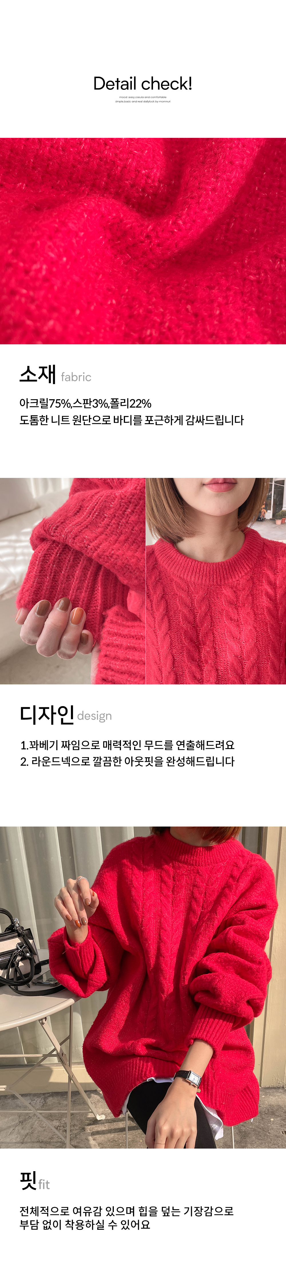TALK 도톰한 꽈베기 짜임의 니트 원피스를 소개할게요:) 전체적으로 여유 있으며 힙을 덮는 기장감으로 부담 없이 착용하기 좋은 아이템 이었어요 레깅스나 롱부츠와 같이 스타일링 해주시면 더욱 멋스럽구요 베이직한 디자인으로 매 시즌 마다 착용하기 좋은 아이템 이랍니다~ ♡맘누리의 옷은 출산 후에도 예쁘게 입으실 수 있어요! SIZE TIP free size / 55~88 개인 체형에 따라 핏이나 기장이 달라질 수 있으니, 구매 전 상세 사이즈를 꼭 확인 부탁드립니다. 피팅 FITTING 지혜 모델 (레드 컬러 착용) ![]() ![]() ![]() ![]() ![]() ![]() ![]() ![]() ![]() ![]() ![]() |