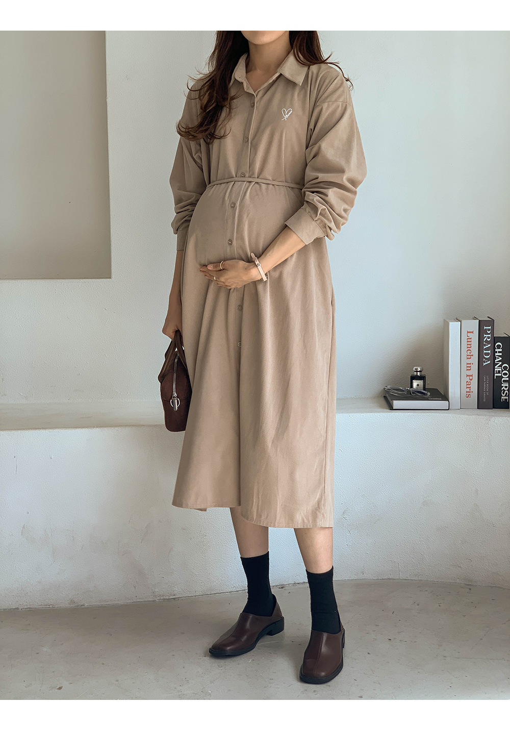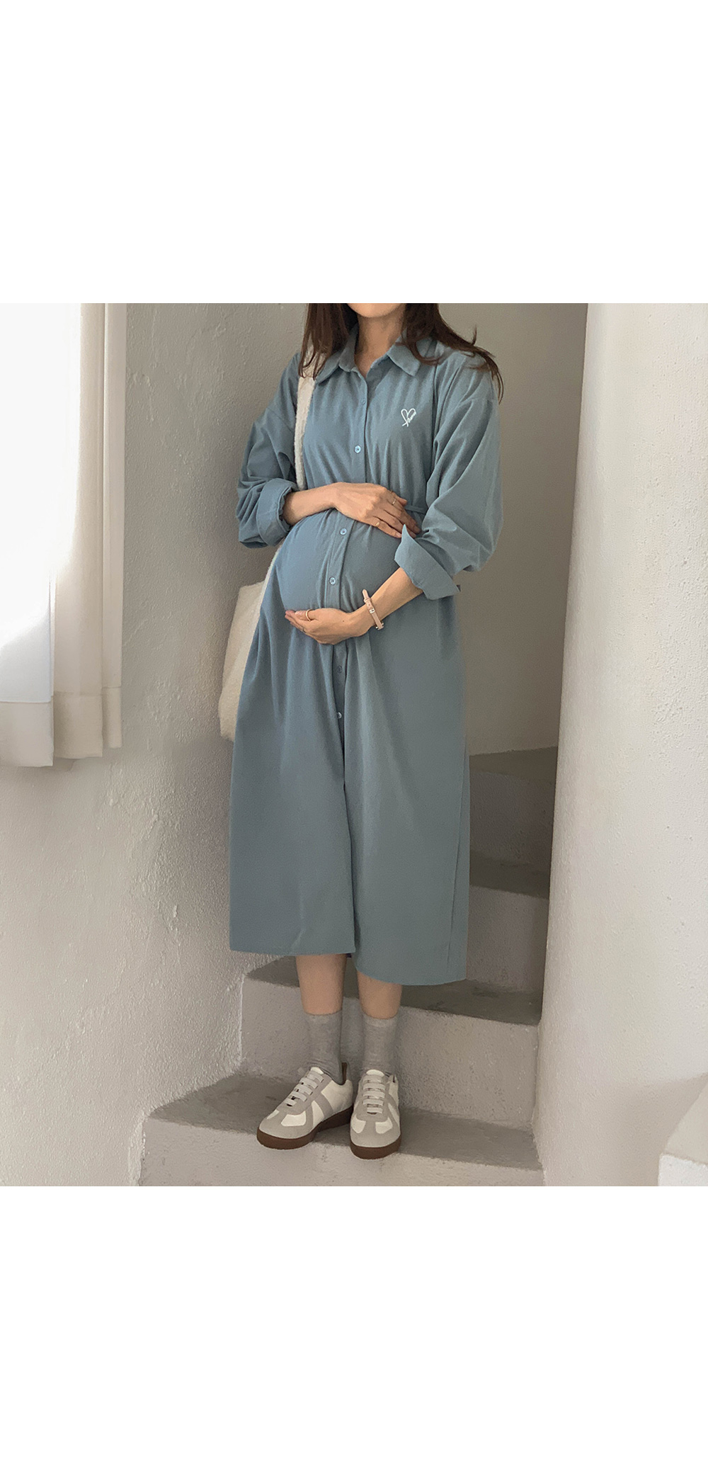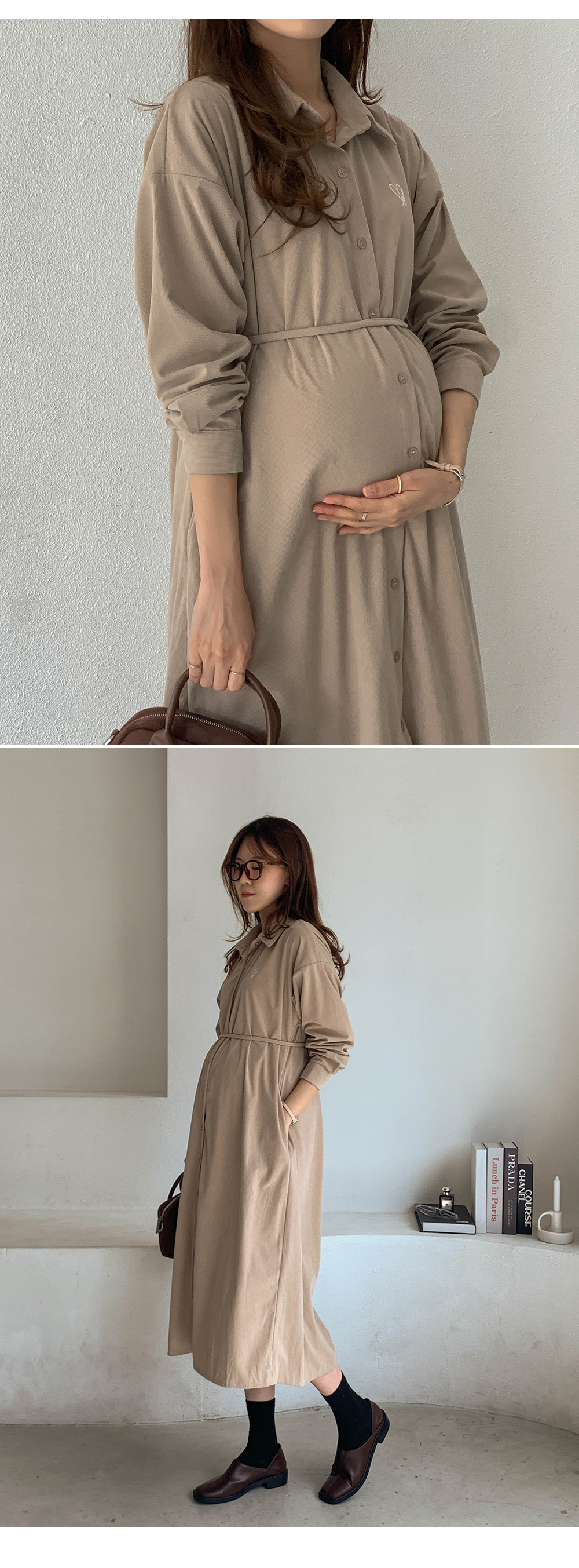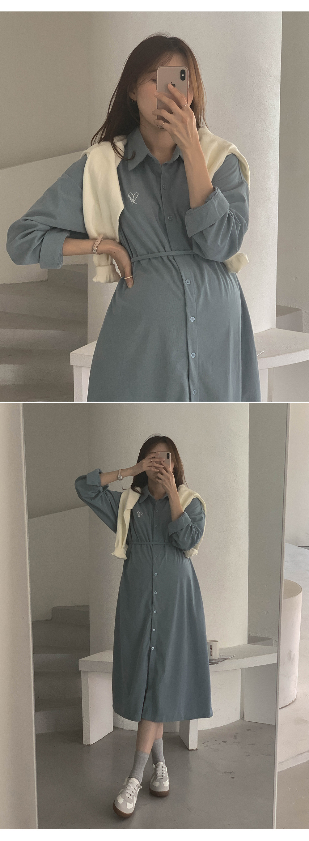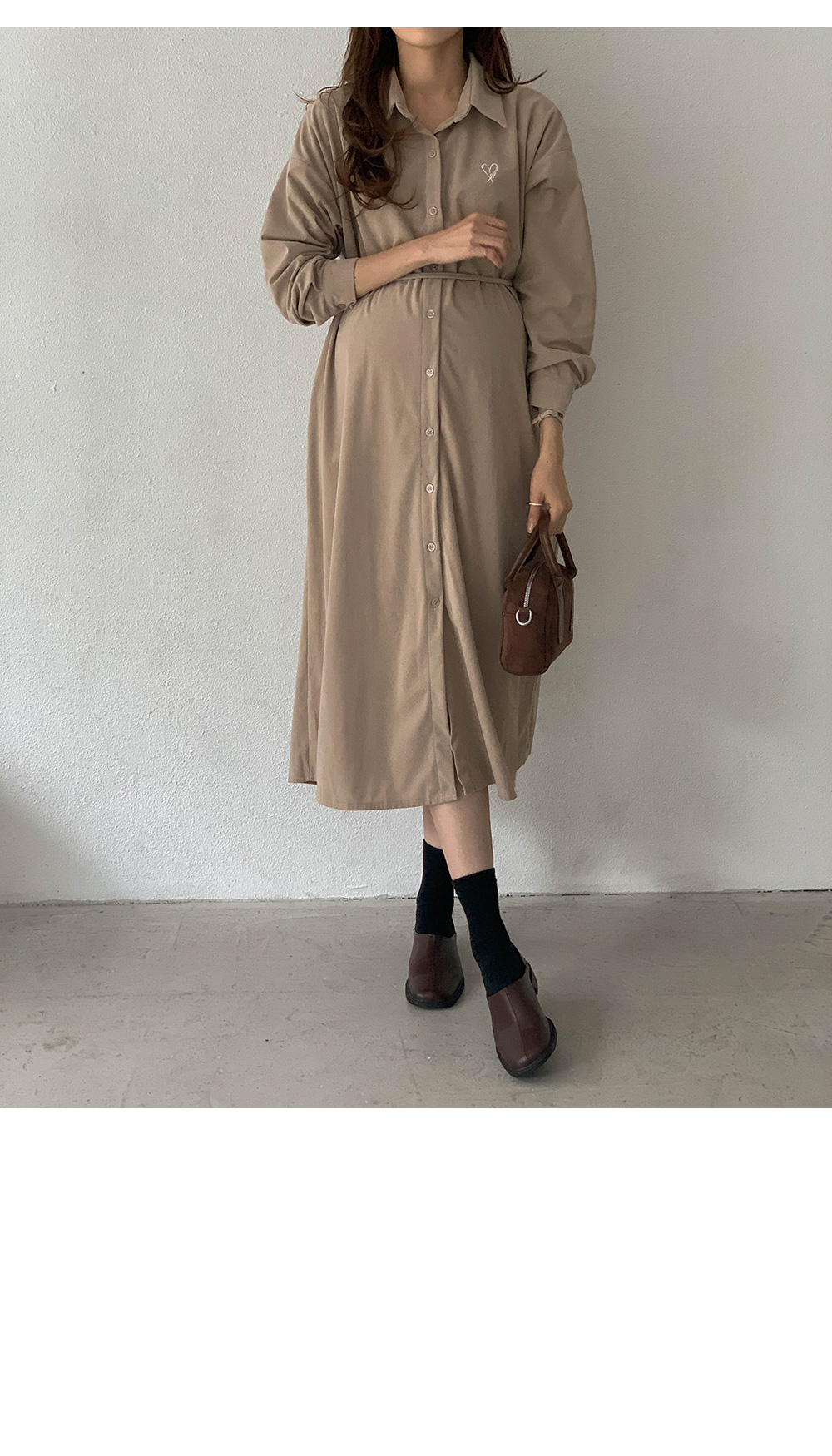 Maternity*Heart-embroidered corduroy shirt dress)